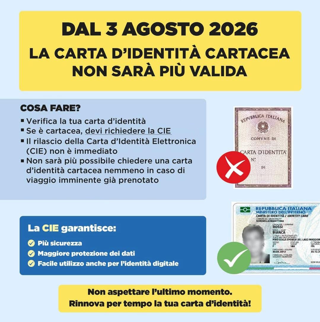 Il Comune di Sant’Angelo dei Lombardi rende noto che il Ministero dell’Interno, con Circolare DAIT n. 76 del 13 ottobre 2025, ha chiarito in via definitiva che a partire dal 3 agosto 2026 tutte le carte d’identità cartacee perderanno validità, indipendentemente dalla data di scadenza riportata sul documento.